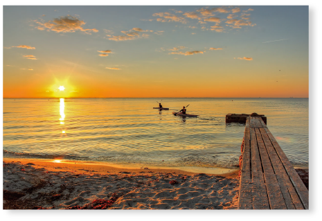 Motiv "Noch 'ne Runde". Wir schnappen uns die Kajaks und fahren noch mal raus. Ein bisschen umherfahren und den Sonnenuntergang genießen.