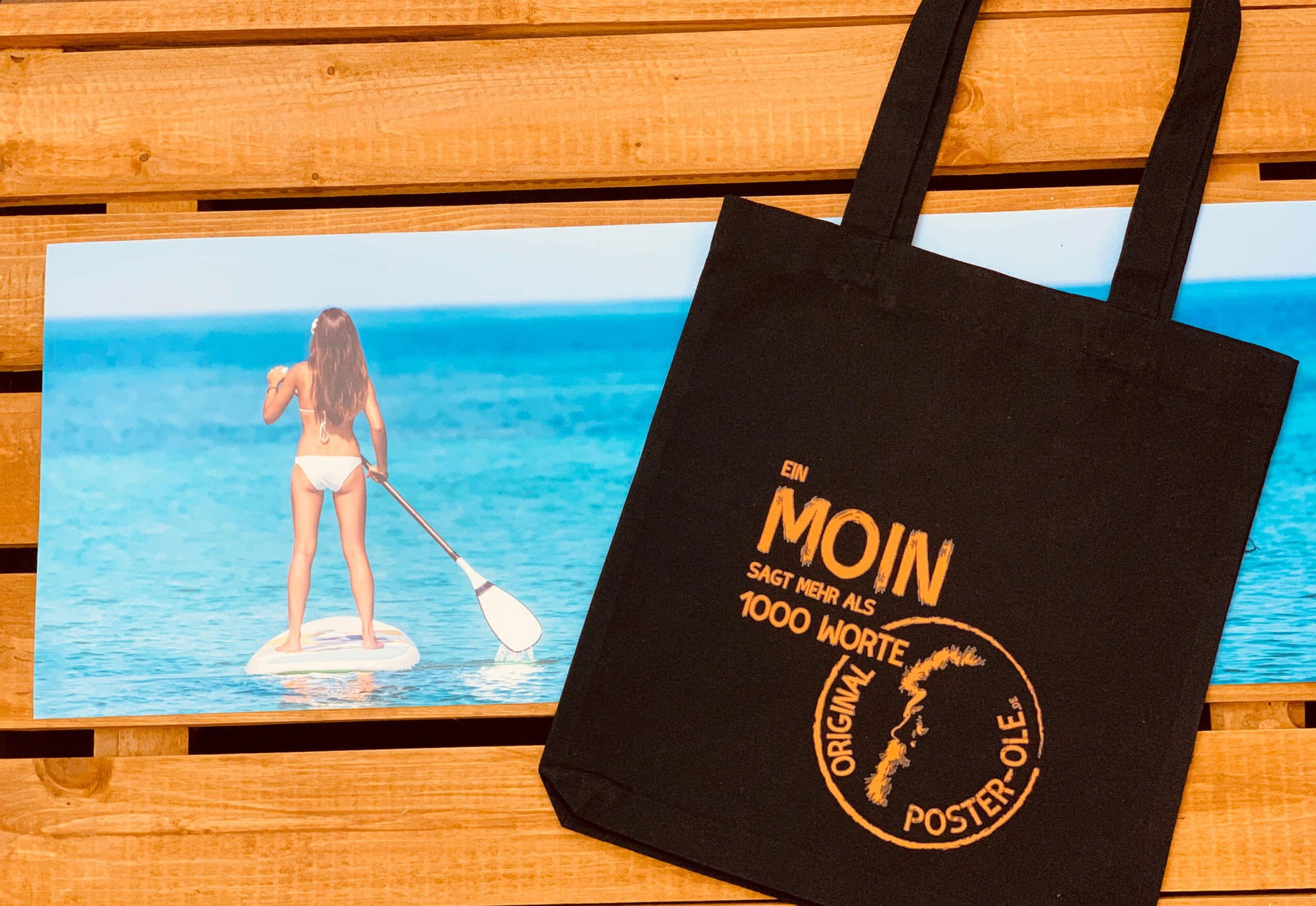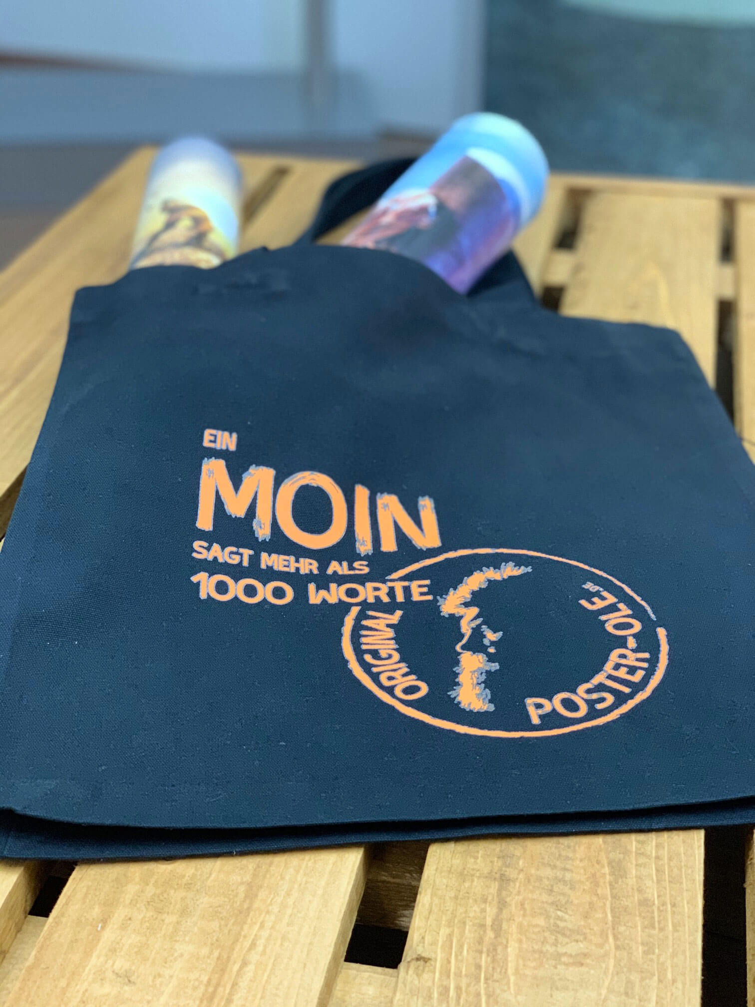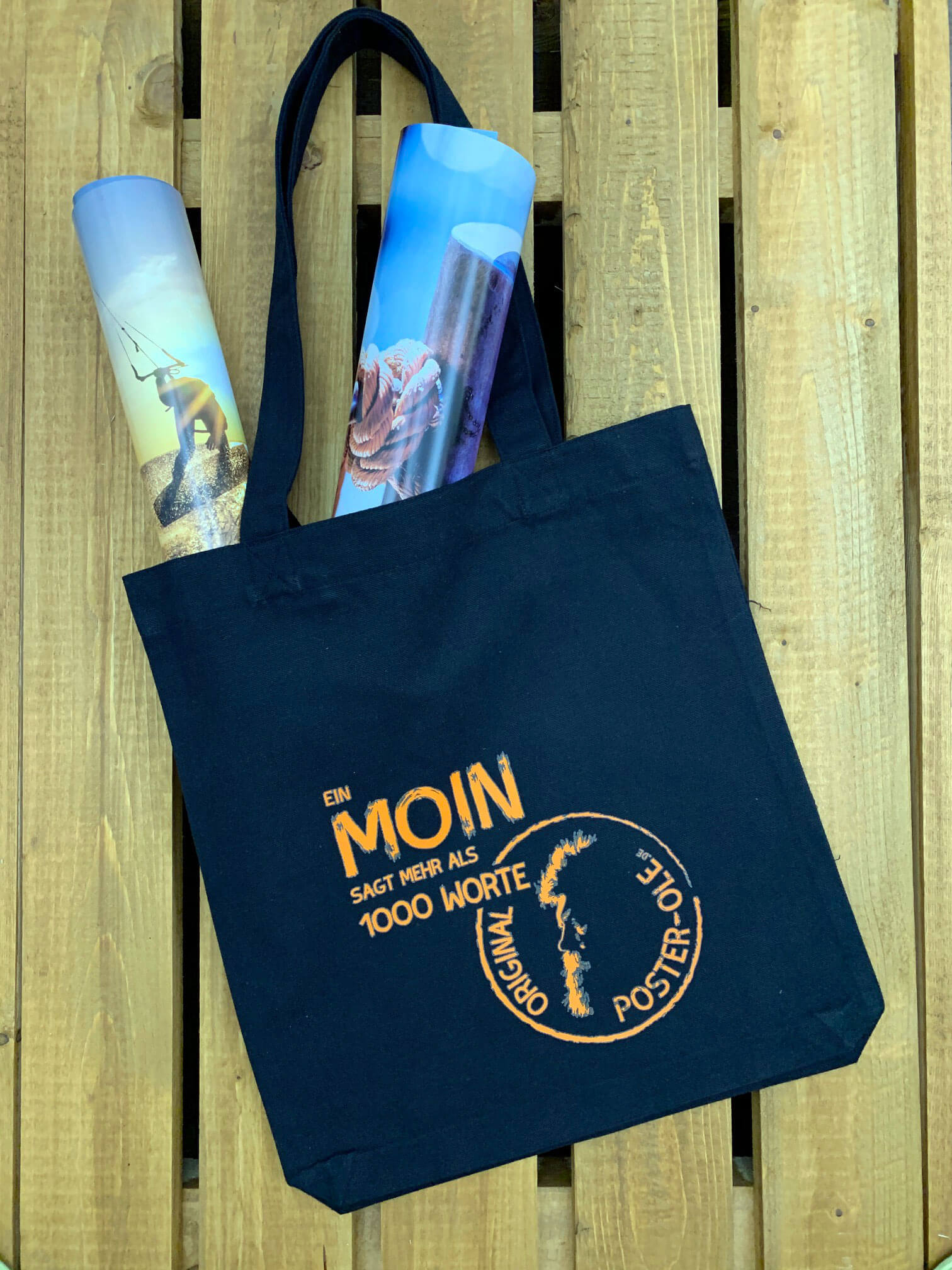 Die Tasche ist schwarz und beidseitig bedruckt. Auf der einen Seite das Logo von Poster-Ole. Auf der anderen Seite zusätzlich der Spruch: Ein Moin sagt mehr als 1000 Worte. Garantiert ein Hingucker.